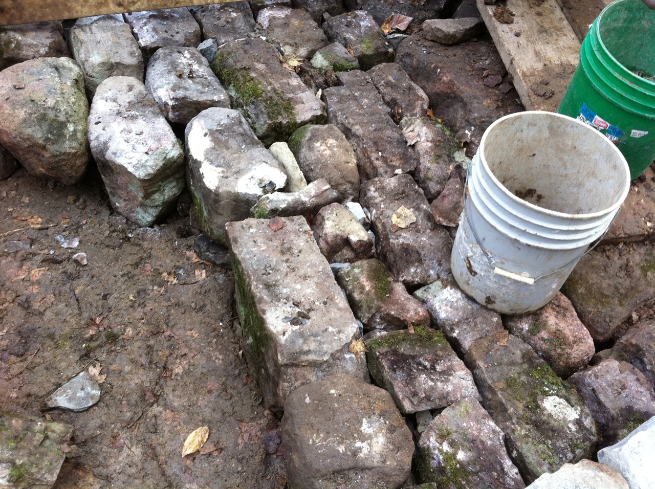 We are doing this because at this bridge site the river bed could wash away and undermine the foundations. I have seen this kind of stone 'roadway' below several old arched stone railway bridges in southern Ontario. The stones are laid to form a kind of cobblestone surface.